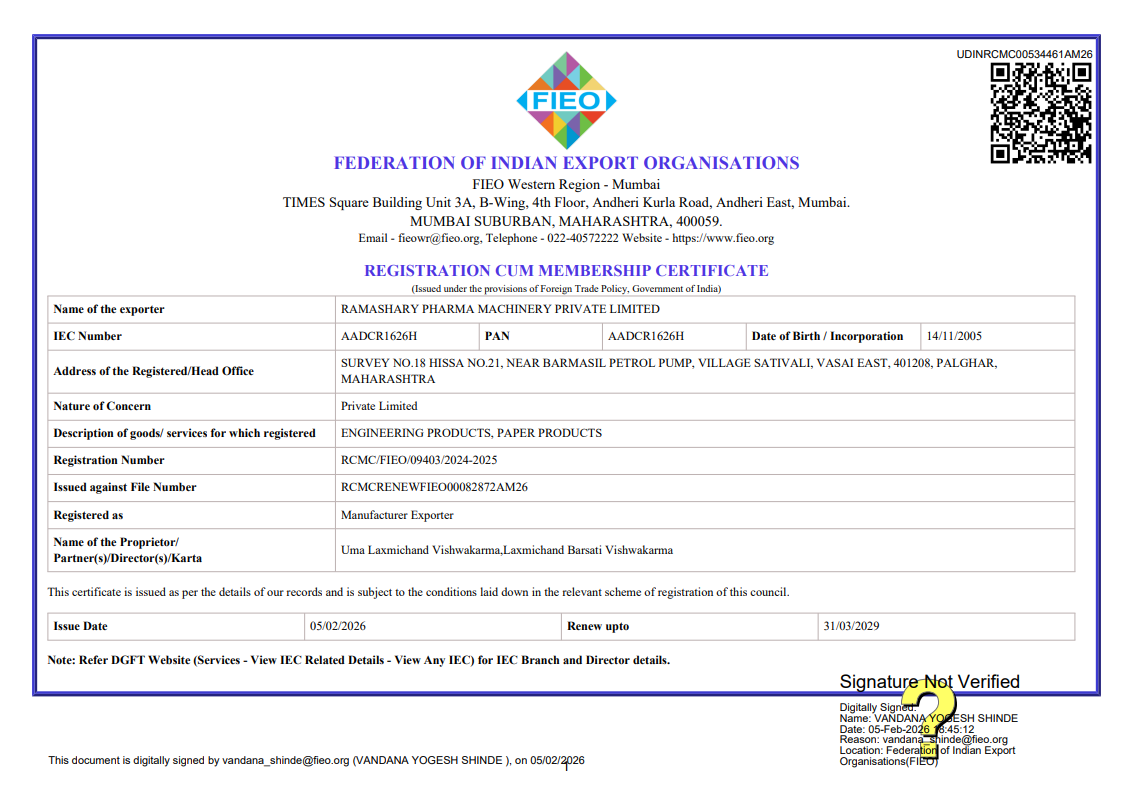 At Ramashary Pharma Machinery Pvt. Ltd., we understand the need for appropriate certificates and registrations to comply with the regulations imposed by the Indian Government. Thus, we possess the mandatory certificates.
